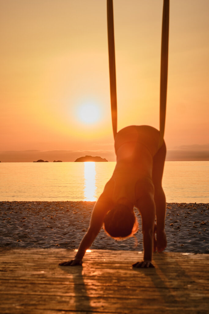 I miei amici mi parlavano continuamente di Ibiza. Quest’isola ha la reputazione di essere una destinazione festaiola, ma quando sono arrivata ho trovato l’esatto contrario. Qui esiste un mondo di pace e tranquillità nel quale mi sono sentita subito in sintonia. Sull’isola ho creduto di avere un’opportunità e di creare qualcosa che mi appartenesse. La cosa incredibile è che persino le zone dell’isola più movimentate mi hanno ispirato: fu proprio a Playa d’en Bossa, la spiaggia urbana più popolare dell’isola, piena di beach club, che ho pensato: “Vorrei trovare un luogo per appendere un’amaca e praticare Aerial Yoga”.