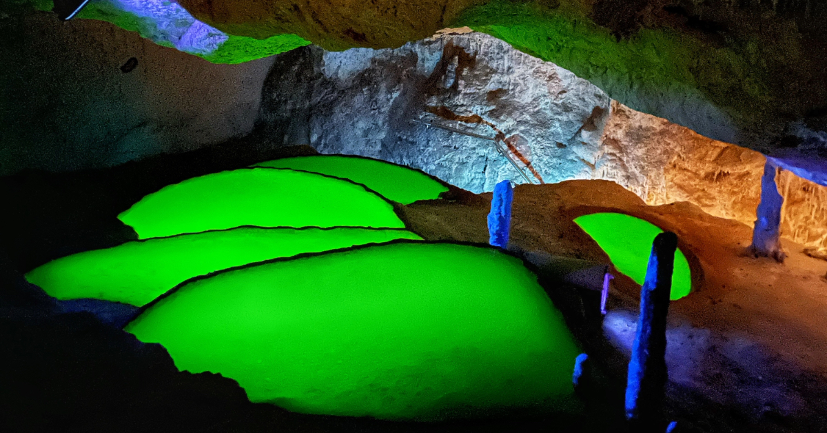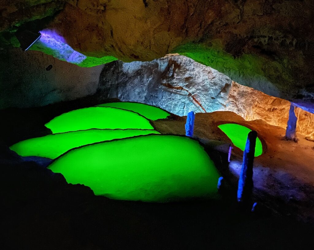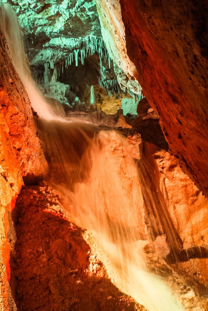 L’acqua presente in grotta è un artificio creato dall’uomo attraverso un sistema di pompaggio idraulico che ricrea l’habitat originario. I geologi hanno ricreato l’ambiente ipogeo con specchi d’acqua, alcuni dei quali ripropongono uno scenario creativo: nel buio di una delle cavità risplendono tre laghetti fosforescenti che degradano terrazzati uno sull’altro seguendo la morfologia della sala. È stata inoltre ricreata una cascata che viene azionata solo durante le visite, uno scroscio d’acqua di diversi metri accompagnata da luci e suoni che creano uno spettacolo davvero suggestivo.