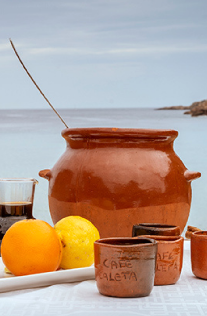 Mio nonno era pescatore e uno dei suoi punti preferiti per la pesca era proprio il braccio di mare di fronte a Sa Caleta, e nell’omonima baietta attraccava il suo barchino. Era molto legato all’isola, ma in giovane età la lasciò per svolgere il servizio militare nel Nord della Spagna, a La Coruña, ed è proprio lì che gli venne l’idea. Quando tornò riprese le sue abitudini, e la domenica, terminato di “faenar” (verbo spagnolo che indica i lavori connessi con la pesca), per rilassarsi da solo o in compagnia degli amici, preparava questo particolare caffè la cui ispirazione veniva dalla “queimada galiziana” però adattandola con gli ingredienti che aveva a disposizione: il caffè d’orzo e l’unico superalcolico che arrivava, per lo più di contrabbando, il Brandy, aggiungendo delle bucce di arancia e di limone. Quando venne aperto l’aeroporto di Ibiza, il primo direttore responsabile che arrivò da Madrid venne invitato da mio nonno che gli offrì questo caffè dopo aver pranzato. Il direttore ne rimase estasiato e chiese come si chiamasse questo tipo di caffè. Mio nonno gli disse che non aveva un nome ma di fronte alla sorpresa del Direttore, tra il serio ed il faceto, gli disse: “Si chiama… Cafè Caleta”. Ora è diffuso in tutta Ibiza e tutti utilizzano questo nome, è un’eredità dell’isola non solo della mia famiglia.